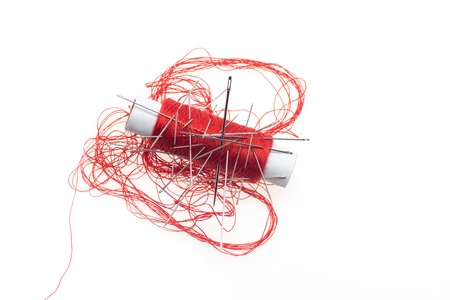 Nice red thread for sewing with different needles in it Isolated on the white background