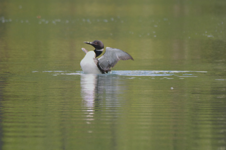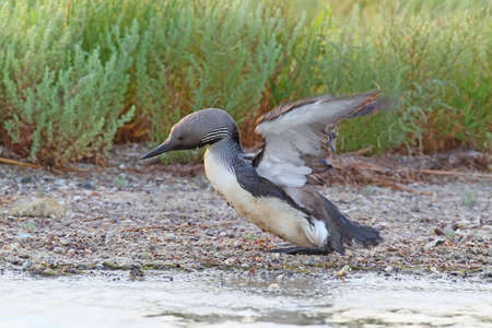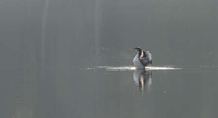 Common Loon, Gavia Immer, stands up in water, flapping his wings, displaying winter tan colors, on a lake surface in soft sunlight.
