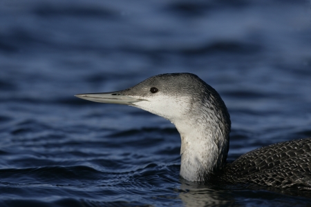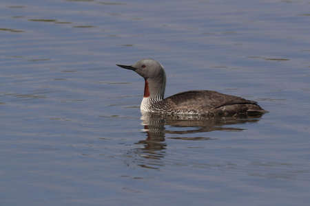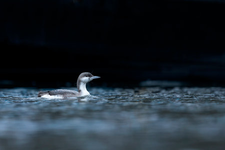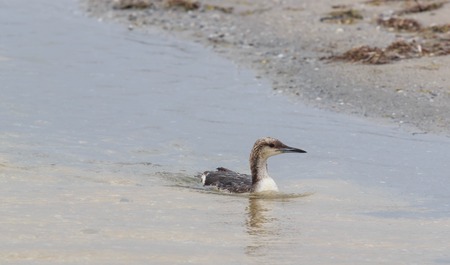 Close-up photo of a red-throated loon in winter plumage swims in the water of the estuary