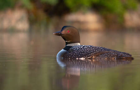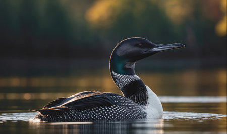 Common Loon - Gavia Immer - in winter colors, swims slowly along on a lake surface. Subdued soft Sunshine illuminates the forest behind.