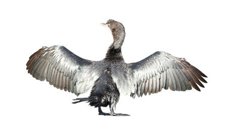 Little cormorant or Javanese cormorant spread wings isolated on white background.