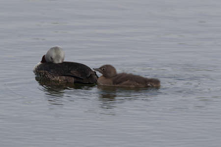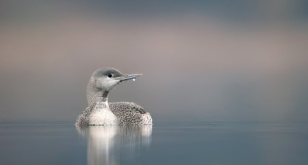 A two-month old Common Loon chick (Gavia immer) and its reflection in the water in late summer - Haliburton, Ontario, Canada