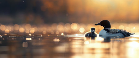A loon and its chick swim on a calm lake at sunset, with the golden light reflecting on the water.