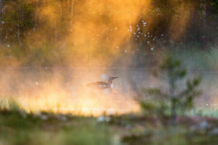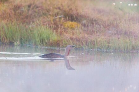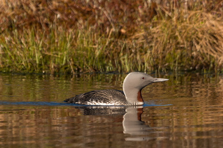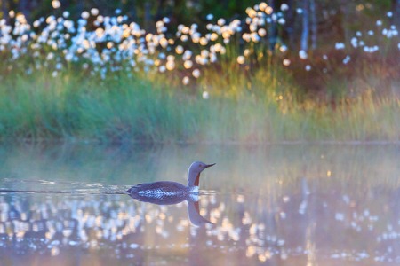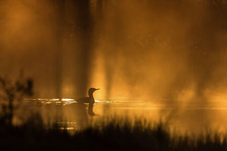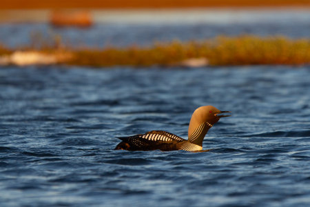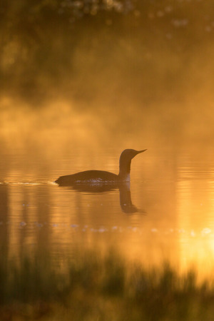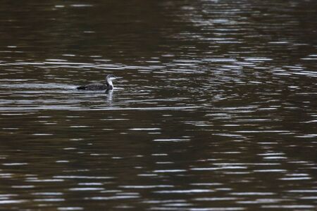 A black-throated loon swimming in the setting sun in the Netherlands.