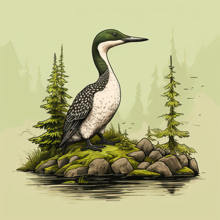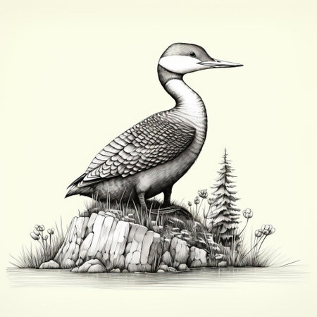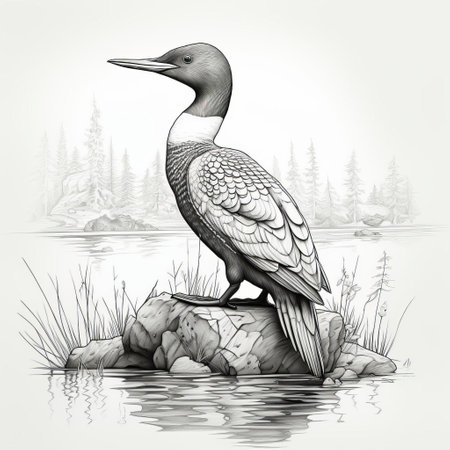 the common loon stands majestically on a bed of lush green moss in this stunning line art piece, showcasing its distinctive black and white feathers, with subtle shading and delicate lines that capture the essence of this aquatic bird's serene nature in its natural habitat. ai generated