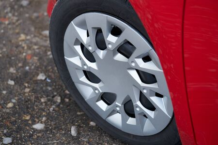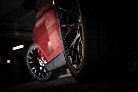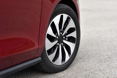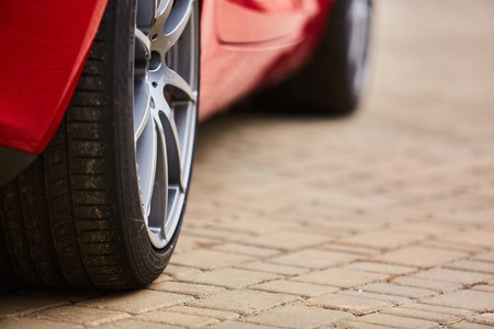 Closeup of a modern red sport car wheel in the parking lot