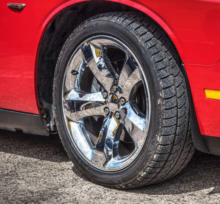 Close up of a chrome wheel of a red muscle car