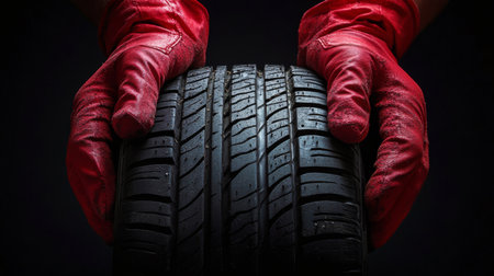 A mechanic wearing bright red gloves holds a tire, assessing its condition in a low-light workshop. The focus is on the texture of the tire and the hands working with precision during nighttime.