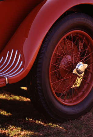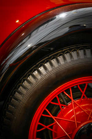 Detail of the front wheel of a red vintage car.