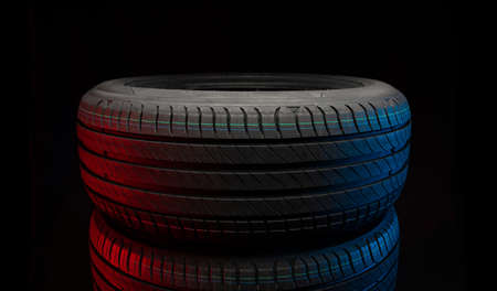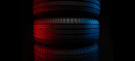 Four car tires stacked on a black background and patterned with blue and red lights. 3d illustration