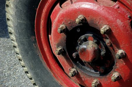 Closeup photo of rusty red car wheel