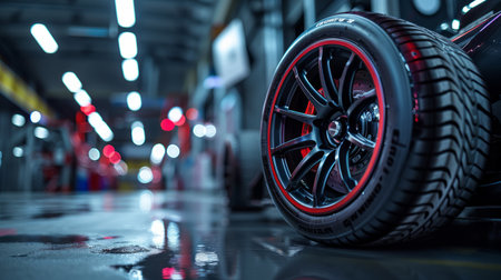 Close-up view of a shiny car tire in an auto repair shop. The emphasis on the wheel highlights precision engineering and provides an insight into automotive maintenance.