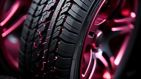 This captivating close-up image showcases a tire tread highlighted by vibrant neon lights in an abstract setting, emphasizing texture and design elements.