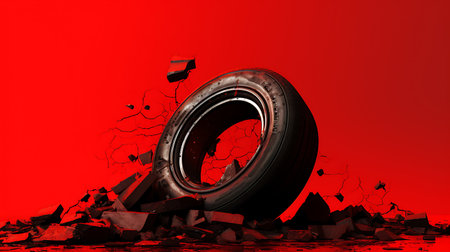Tire with cracked wall on red background. 3D illustration.