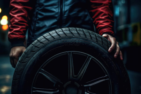 Close up hand of Car tire service and hands of mechanic holding new tyre