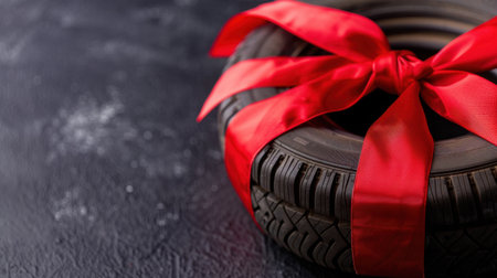 A creatively wrapped tire with a vibrant red ribbon, set against a dark background, symbolizes a unique and playful gift idea for any occasion.