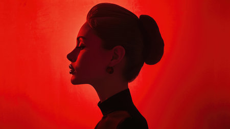 This artistic image features the silhouette of a woman with stylish short hair against a striking red background, creating a bold and dramatic visual impact.