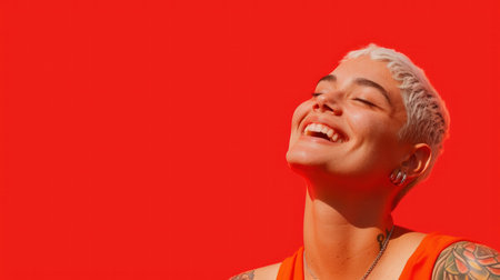 A joyful woman with short hair and tattoo smiling against red background