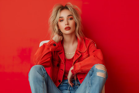 A fashionable young woman in a red jacket and jeans, seated gracefully on the floor.