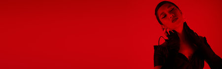 seductive asian woman in black elegant dress and long gloves touching neck while posing with closed eyes on vibrant background with red lighting effect, youth culture, stylish spring concept, banner