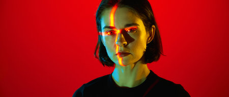 One charming woman with piercing in nose looking at camera with emotionless face over red neon background. Banner with copy space. Concept of cyberpunk, futurism, human emotions, creativity, art, ad