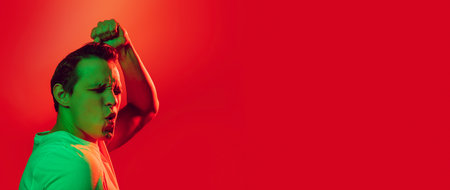 Neon portrait. Advertising people. Green color light smiling handsome guy face isolated on bright red empty space background.