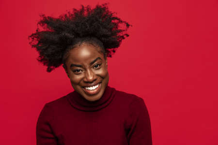 Beautiful cheerful young african woman wearing sweater standing islolated over red background