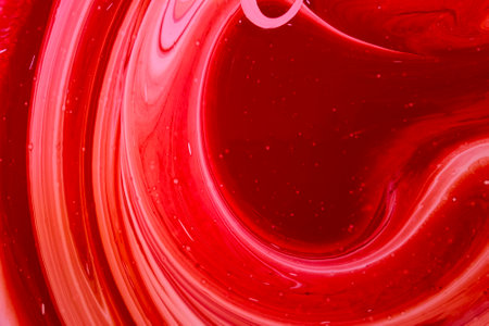 Beautiful abstraction of liquid red and pink paints in slow blending flow mixing together gently.