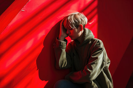A young woman is sitting on a red wall with her head on her hand. She is wearing a green hoodie and she is in a state of distress