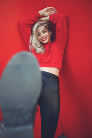Young woman in hoodie on red background. Curly brunette poses near red wall