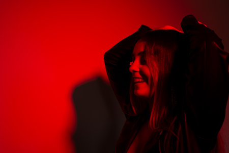 Young pretty woman looks at camera in contrast red light, sensual fashion beauty