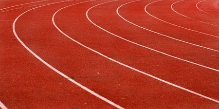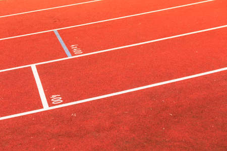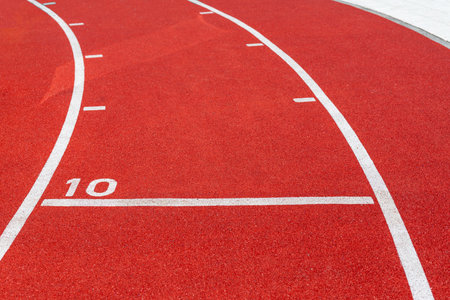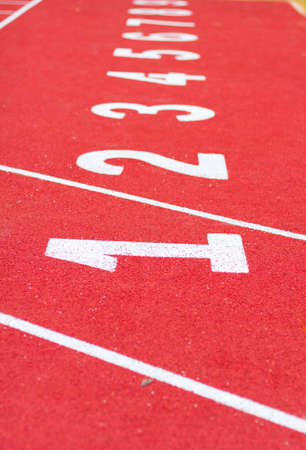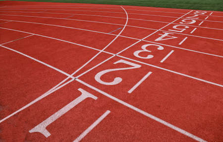 Red track and field lanes and numbers. Running lanes at a track and field athletic center. Horizontal sport theme poster, greeting cards, headers, website and app