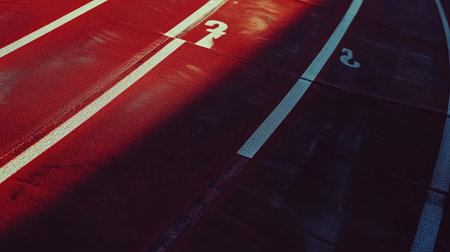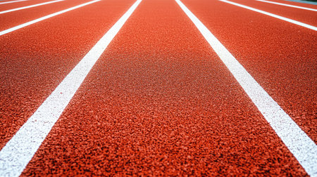 Close-up of a vibrant red running track featuring white lines, showcasing smooth texture. Ideal for representing athleticism, competition, and training activities.