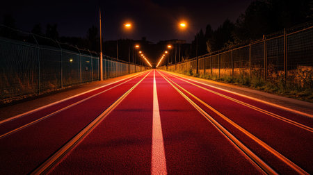 An empty red track under the soft glow of streetlights, with clear lane markings visible.