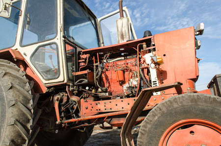 Old dirty tractor on a field with blue sky on background