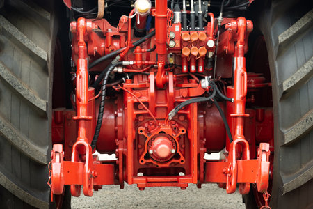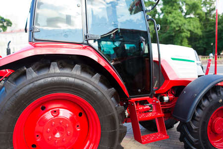 Close-up of part of the new red tractor. Vehicle assembly.