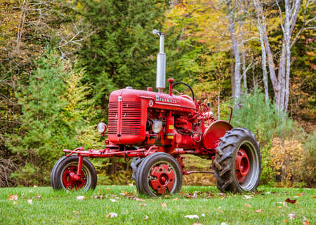Exeter, New Hampshire - October 13, 2018 - old red tractor sits in yard