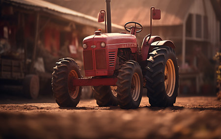 Red toy tractor farm soil tree green outdoor miniature agriculture playful landscape scene with cheerful mood