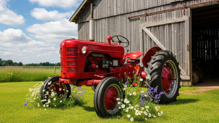 Vintage red tractor by barn with wildflowers in scenic countryside setting.