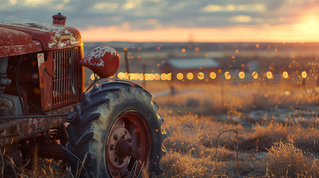 A close-up of a weathered vintage tractor on a farm, with a stunning sunset backdrop and sparkling bokeh lights, embodying rural nostalgia.
