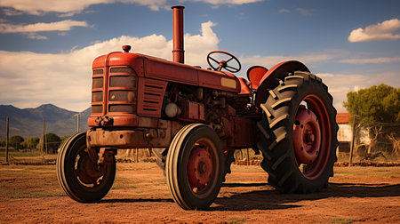 old red tractor on farm over blue sky with clouds