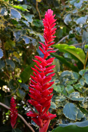 Red ginger flowers, Alpinia purpurata with green leaves in a tropical garden.