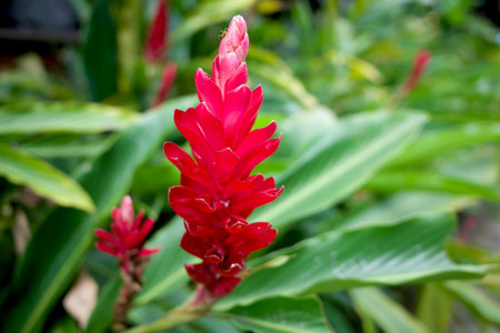 Red, colorful ginger flower in the jungle