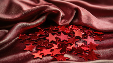 A beautiful arrangement of shiny red stars scattered on a luxurious velvet fabric. Perfect for festive decorations and creative projects with a rich, elegant touch.