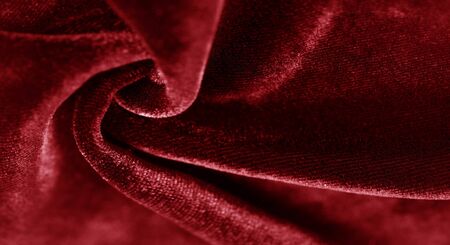 Advertising close-up shot of texture of dark red tone perfect natural velvet fabric chaotically crumpled. High quality photo
