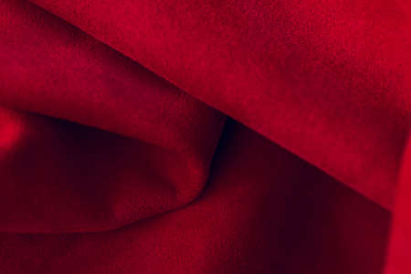 Red matte background of suede fabric, closeup. Velvet texture of seamless leather. Felt material macro. Red suede texture. Fabric, leather, material for designers.