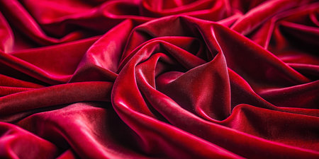 A close-up view of luxurious red silk fabric showcases elegant swirls and delicate folds. Perfect for design projects, fashion shoots, or artistic backgrounds.