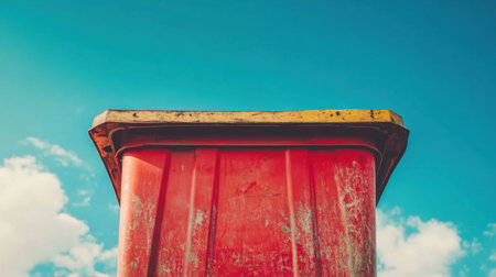 A vivid shot of a bright red trash bin against a backdrop of a clear blue sky filled with fluffy white clouds, perfect for eco-focused projects.