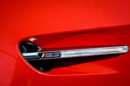 Kharkov, Ukraine - February 24, 2021: Detailed Ferrari sport car toy close up, F430 Spider, background with macro car aspects, copy space banner photo