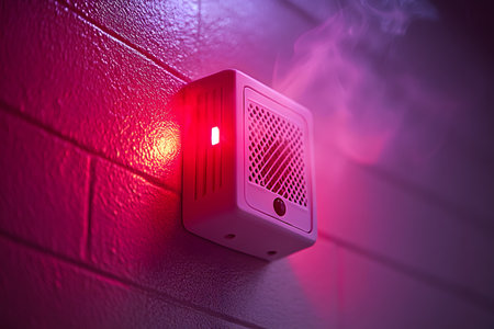 Emergency alert system activated, featuring a glowing red light and gentle smoke against a textured brick wall. ideal for illustrating safety alerts, warning systems, or atmospheric emergency scenarios. Generative AI